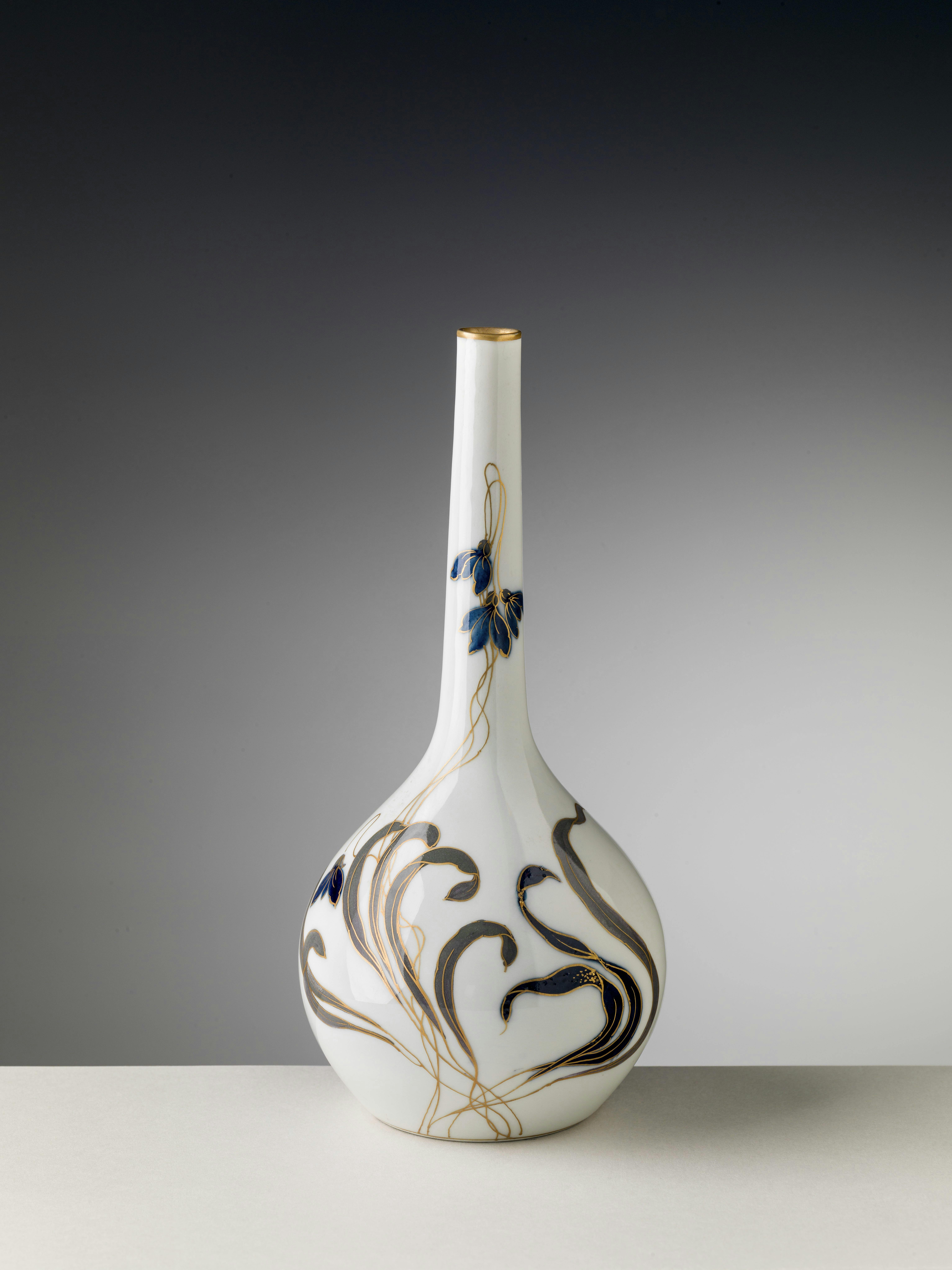 This vase with a smooth body and long neck is embellished with a stylized painted decoration depicting blue cyclamens and green leaves on a very pale green background. The golden lines, graphically traced to mimic the curves of the stems, roughly outline the shapes of the corollas and foliage as well. The interrupted strokes help enhance the sense of flatness created by the simplified representation.